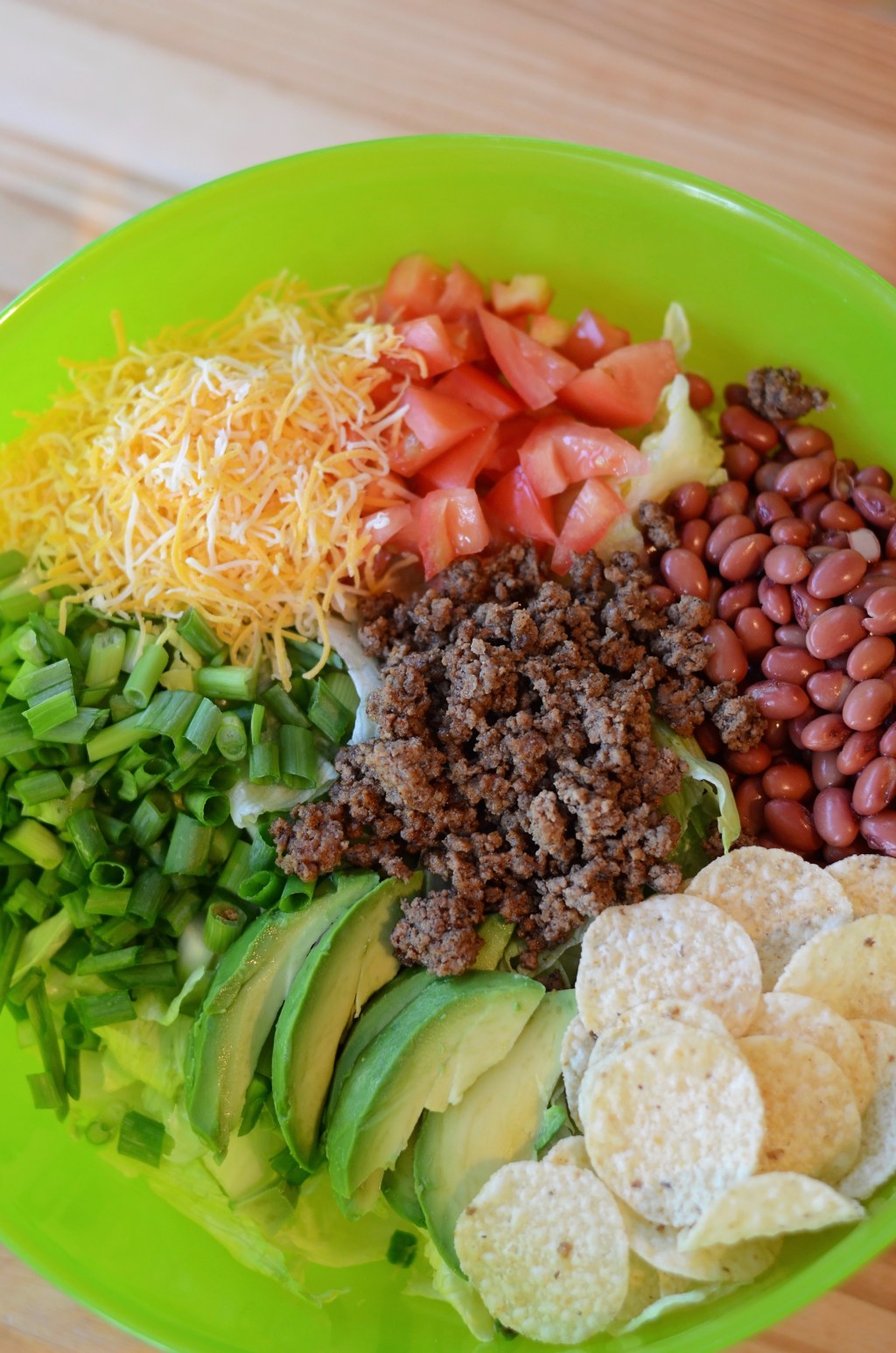 So taco salad still counts for Taco Tuesday, right?! I grew up on this recipe and it is SO easy. It also makes enough to feed a small army; granted, I’m usually only cooking for myself and a four year old, so I always have leftovers. On to the recipe!