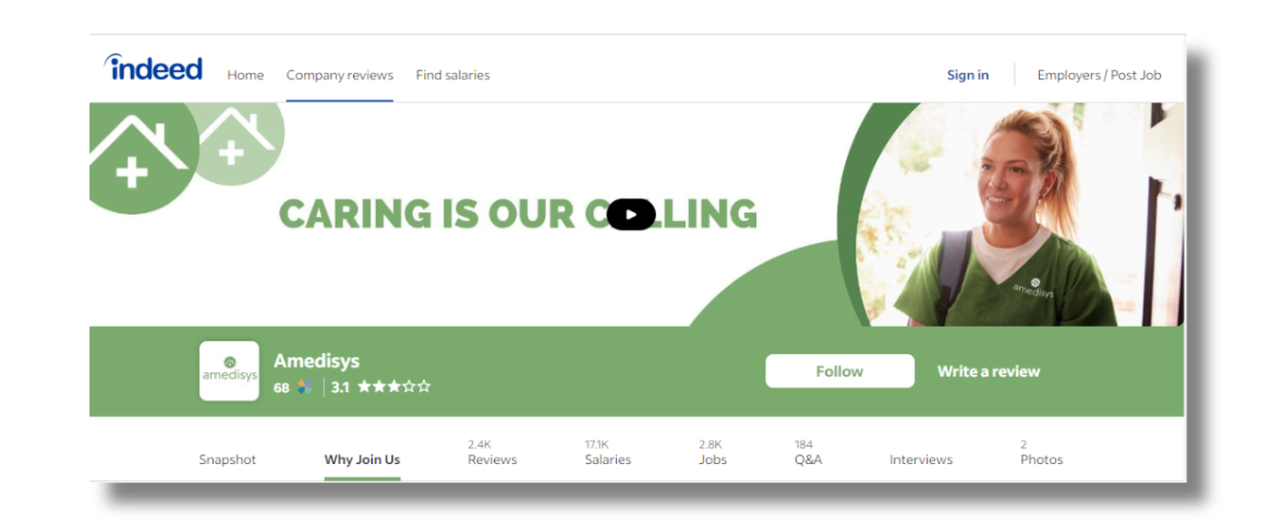 Under my leadership, my team implemented Indeed/Glassdoor Employer Brand Hub. This means we went from free pages with little customization, to fully built out employer branding. This includes graphics, copy, videos and more, with the goal of making Amedisys attractive to job seekers.